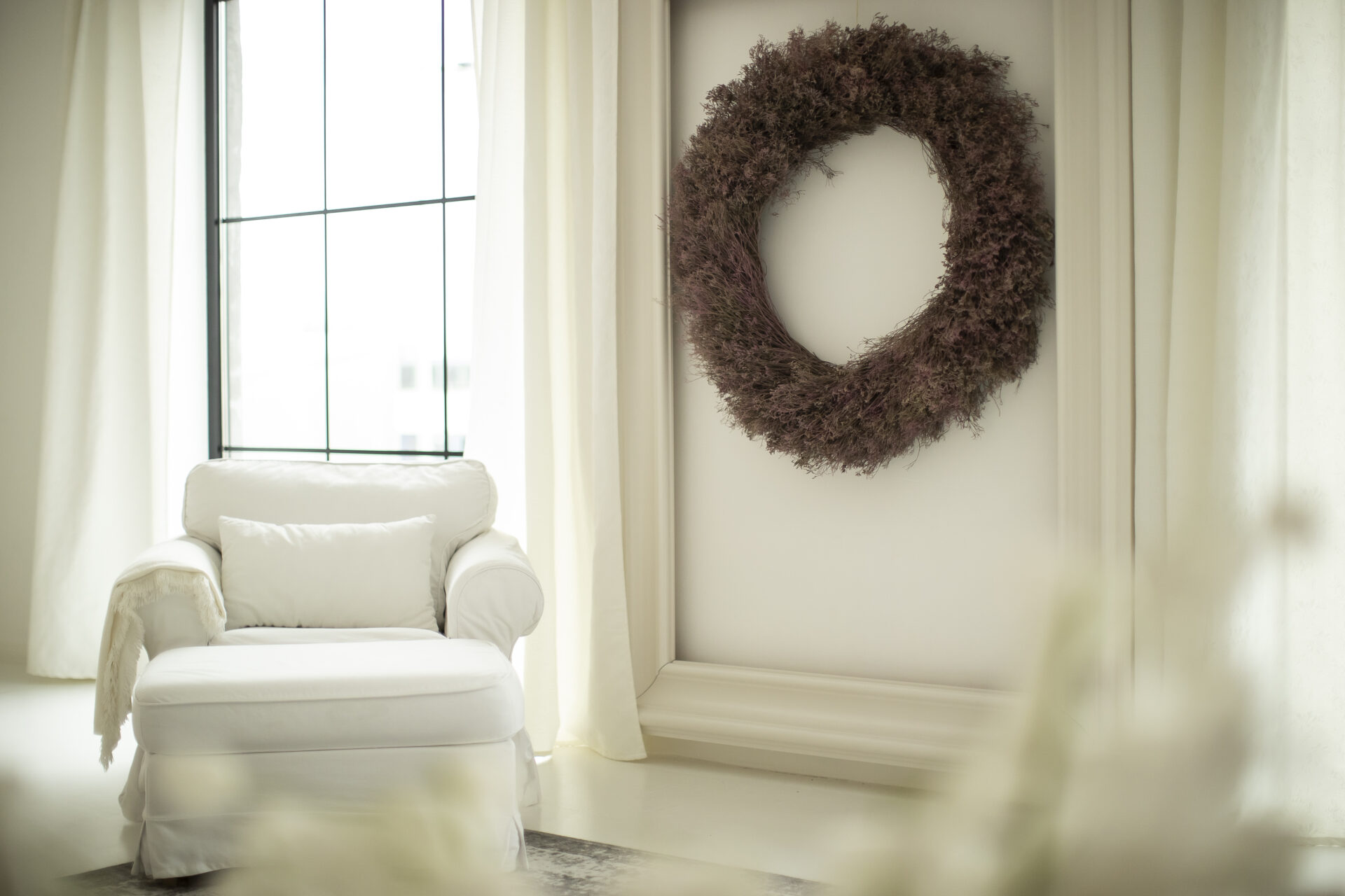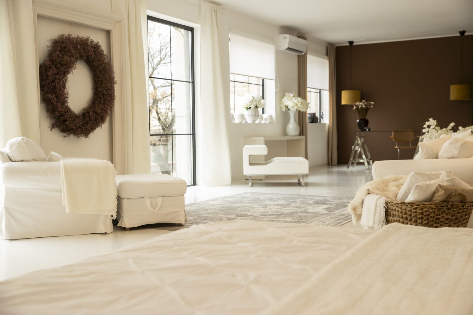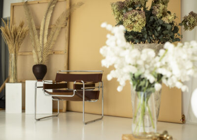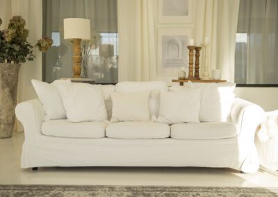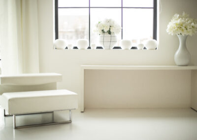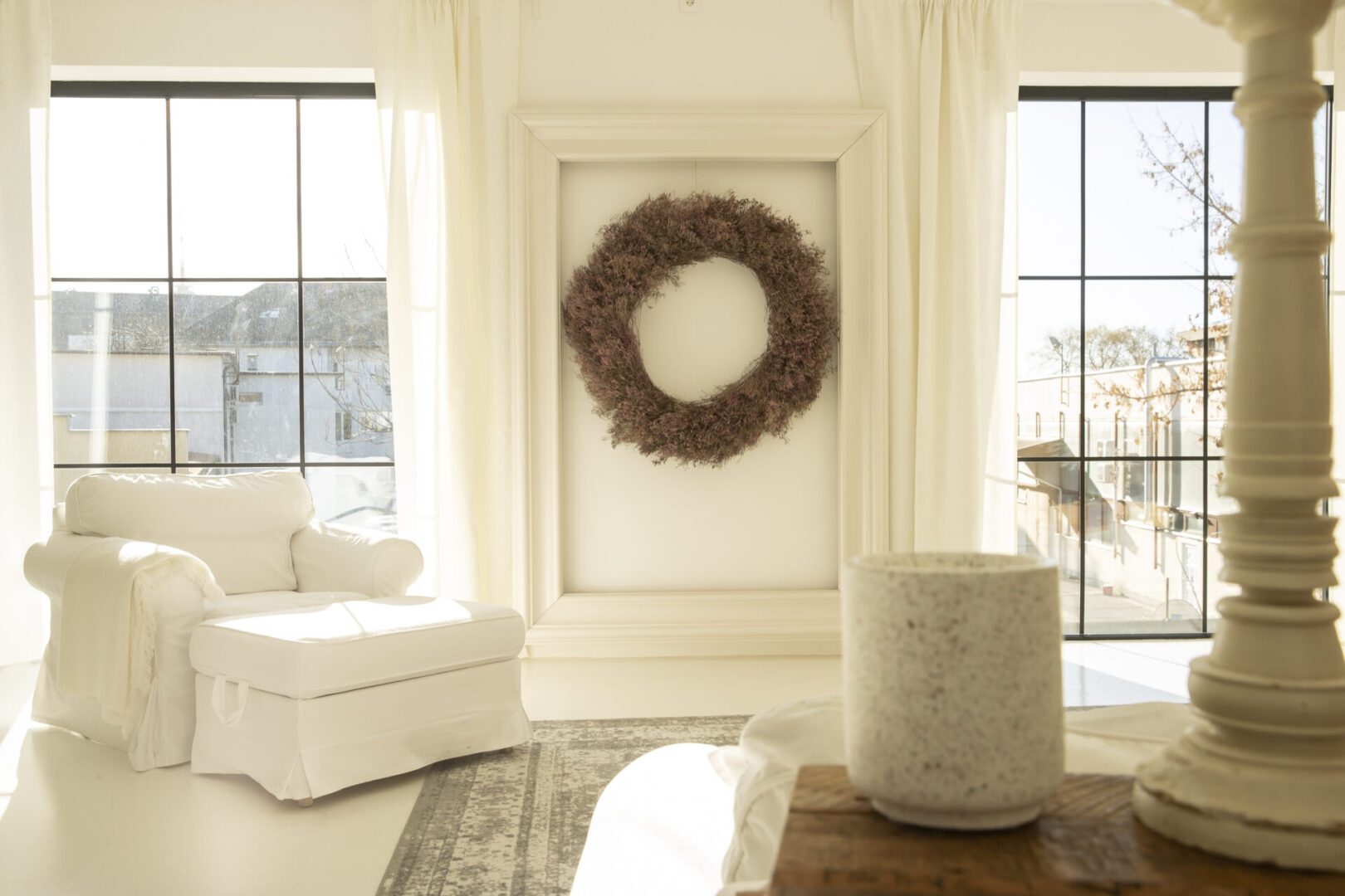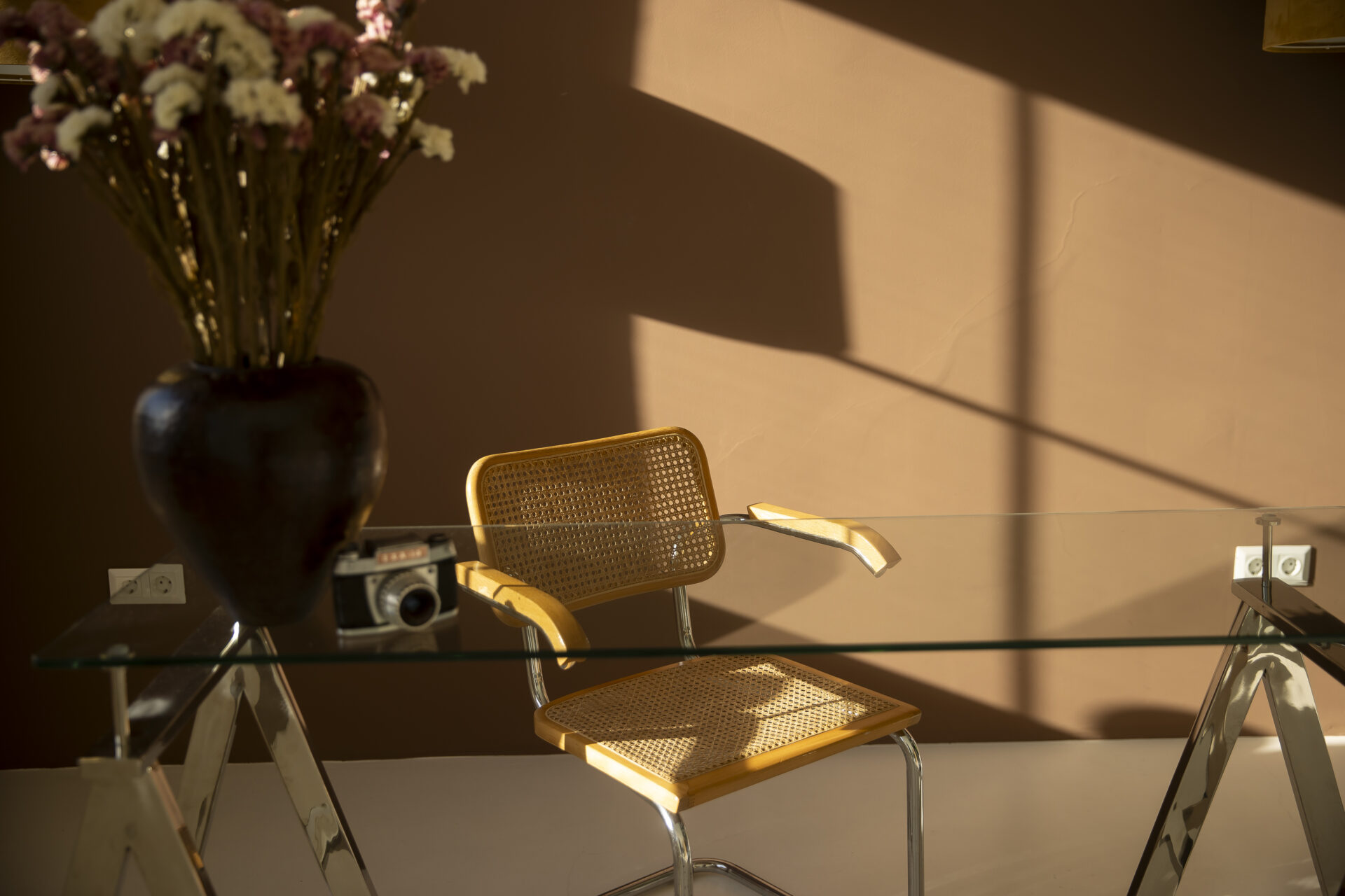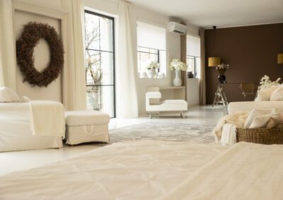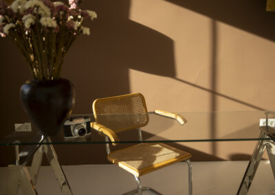Öt nagy ablaka van két irányból, amiből kettő a padlózatig ér, illetve a belső terek felé is két ablak nyílik.